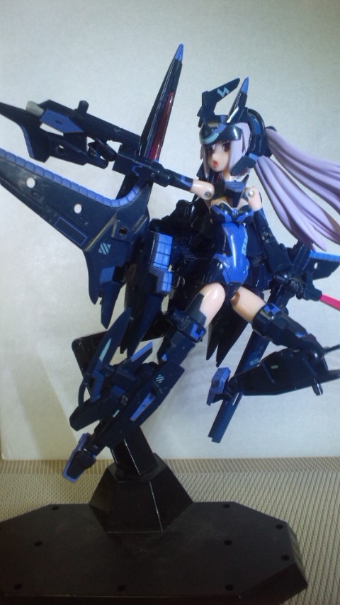 稼働個所は結構多くていろいろなポーズを取らせることができます。ただ、欠点としてハメコミ部分の結合が弱いところもあり、きっちり組んでもすぐとれてしまうところも結構あります。あと自立が難しかった。。。上の写真は足に両面テープ張って無理やり立たしてあります。制作時間はだいたい10時間くらい、このシリーズ初めてなので慣れているともう少し早くできると思います。ニッパー等の基本セットの他に接着剤もあればいいかもしれません。このシリーズ、他のキットと共通の軸の径なので武装をくっつけたりもできますので結構面白そうです。武装神姫もそうですがこういう自由度の高いキットは自分の発想力のなさが嫌になってしまいますね。